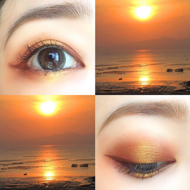 做为带点微闪的4号色和5号色,都适宜用于装点,有很大的调亮作用,4号是在上眼睑中央轻柔刷一下,而5号则是在眼头和眼袋处,轻点一下就行。如此含有橘调的妆容就成功啦,确实很适宜秋冬,配搭完美的日出妆容更搭哦!