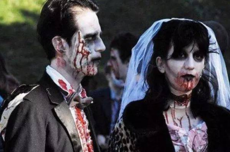 妆容重点:惨白底妆,深色眼窝,猩红嘴唇,嘴角滴血等。