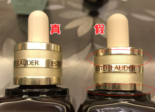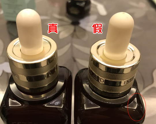 首先是塑胶滴管的对比区别,右边的假雅诗兰黛精华小棕瓶滴管明显发黄,因为家里是暖光灯,上对拍的对比照片可能不是特别明显,但实际肉眼看是有区别的,正品的塑胶滴管颜色较白净一些,假的塑胶滴管发黄了。