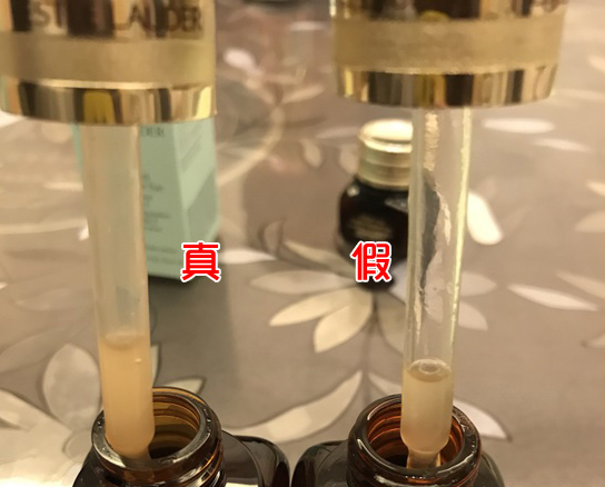 如果说面所讲的包装部分对比还不明显的话,那感觉最明显的就是精华本身了,用过雅诗兰黛精华小棕瓶的朋友其实感觉对正品有感觉的,用过的一眼就能看出来问题,真货的精华液明显要浓稠,而且是不透明的;假的精华液很稀,透明感很强。如果你实际使用一下,会感觉到正品小棕瓶精华液那种绵密而细腻、上肤后浓而不腻的感觉,假的精华液上肤后感觉就太轻薄了,没什么滋养的感觉。