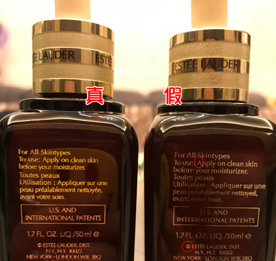 背面的对比区别就明显了,右边假小棕瓶背面这些说明文字做的太细,有些文字直接就是断了笔画的,另外有些则是严重变形,这各情况在正品是不会出现的。关于瓶身,还有一点就是真的瓶身很光滑,质感相当好。而假货的瓶身玻璃不光滑,会有坑洼。大家注意看上面的第一张对比图可能已经发现相同光线下假货瓶身的阴影面多,说明不光滑。