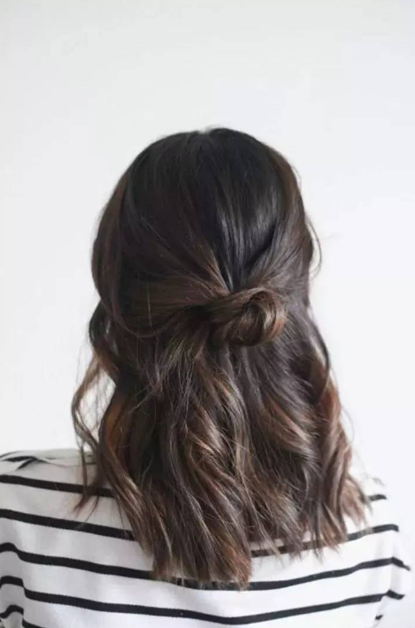 这个编发再简单不过了,非常优雅浪漫的一款发型,左边取出一小缕头发,旋转拧至头部后面,右边同样的方法,最后用一个皮筋绑好两股头发,稍微拉松就好了。
