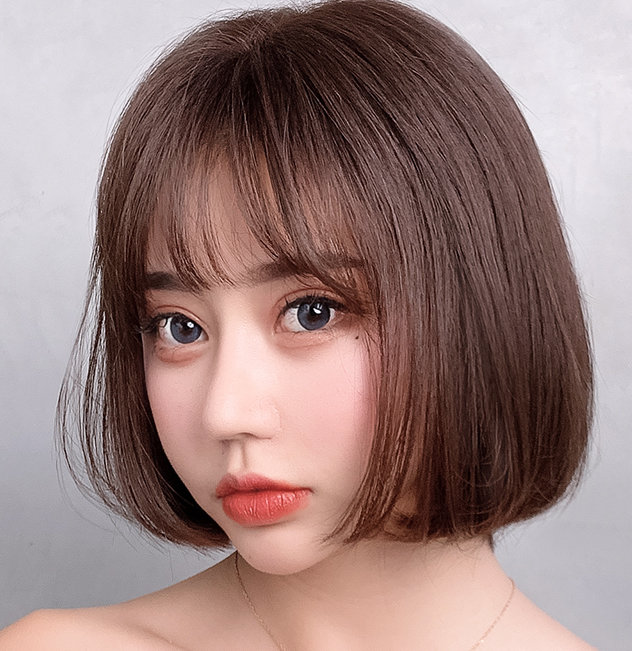 头发长度差不多齐肩的位置,然后在发尾处烫一点微卷,就是现在非常时髦摩卡波波头了,配中分的刘海和棕色的发色,将两侧头发夹至耳后,非常清爽并且显甜美哦。