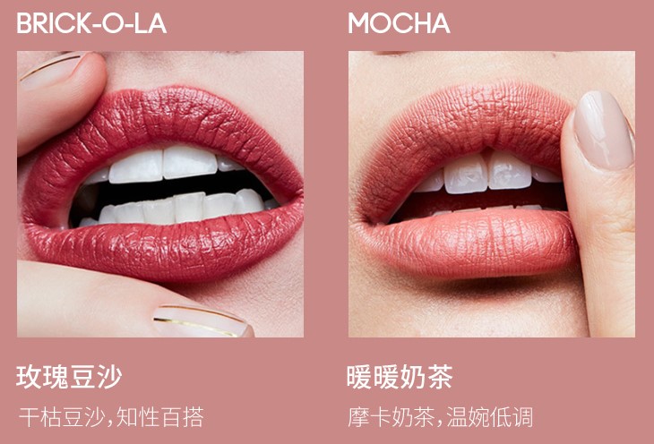 目前为止最正豆沙色,涂豆沙色容易没气色 但是brick o la就不会。浓郁,很秋冬,暖色红调多一点的感觉,总之非常爱!!穿灰毛衣、白毛衣都会很乖的那种啦~