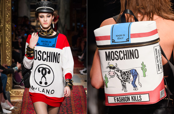 Moschino旗下共三个路线,分别为以高单价正式服装为主的Couture、单价较低的副牌Cheapamp;Chic以及牛仔装Jeans系列。而最直接的辨识方式,便是找到粗体大写的设计师名字MOSCHINO,它一定会出现在服装的布标上,或者偶尔也会变成服装上的图案。对于坚守实穿、优雅路线的米兰时装界而言,有风格戏谑的Moschino的存在实在是个异数。