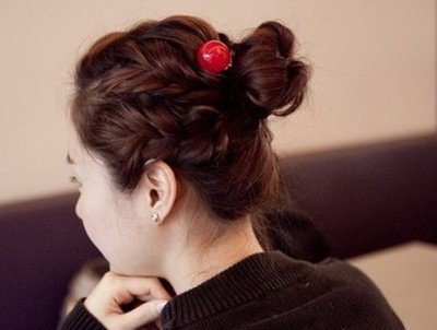 然后把半马尾扭转几圈扎成丸子形状,并用发夹夹紧固定。