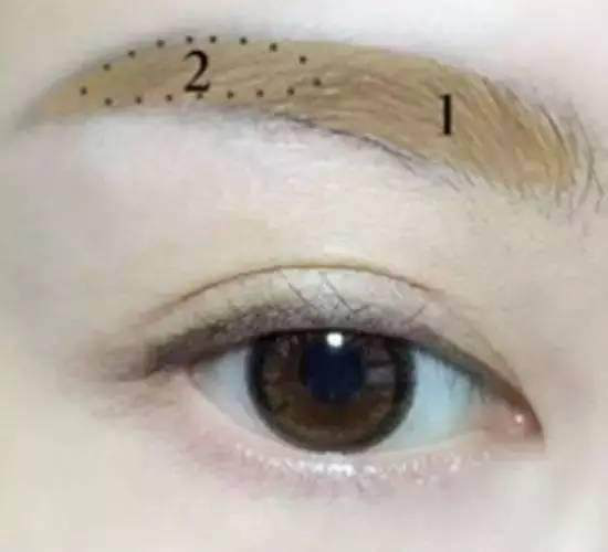 第二步:接着运用眉粉的棕色扫在地区1的地位,深棕色扫在地区2的地位,用斜角刷沾取眉粉,悄悄抖掉余粉,大批屡次。