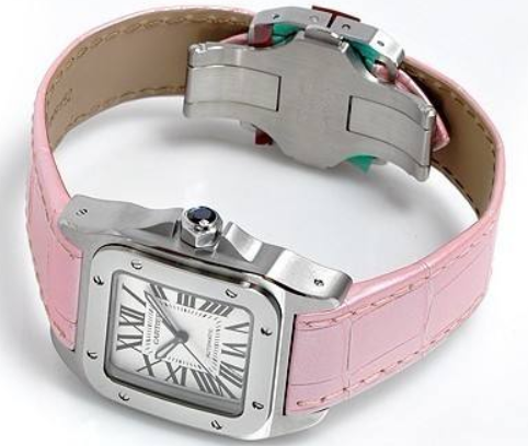 这款卡地亚SANTOS 100属于中号表款,可以适合更多人佩戴。44.2 x 35.6毫米,厚度10.7毫米的精钢表壳。七角形表冠,镶嵌一颗多切面合成尖晶石,延续了卡地亚制表的传统。镀银珠光表盘,夜光剑形黑色氧化钢指针,蓝宝石水晶镜面,做工非常细致但又不失美观。粉色鳄鱼皮表带,不仅佩戴舒适,更可以体现出女性温柔可爱的气质。搭载自动上链机械机芯,保证了腕表的精准和稳定!