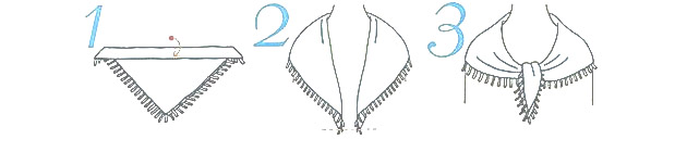 把丝巾展开,按三角形折叠法折成三角形,底边折出一个边。将丝巾佩戴于颈上,底边放内侧,丝巾两端调成一致。将丝巾下端两角系出平结,调整好丝巾的形状,折叠的时候可将底边向里稍折,这样可以使背后的三角形非常漂亮。而底端打结处尽量向下。