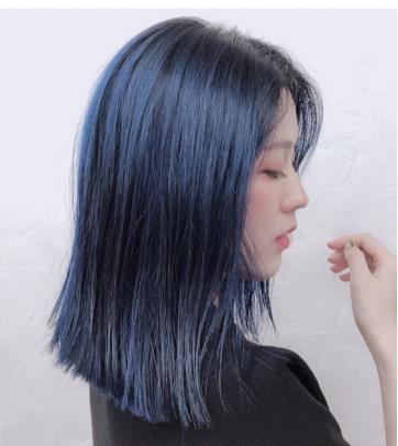 把最深的基色+蓝色工具色按照1.5:1的比例调在一起,然后再加适量的双氧乳。要和刚才调制的染膏的比例呈1:1的调和在一起,然后直接上色。挑染出来的颜色不是很显,但是在阳光底下是特别清晰的蓝黑色,非常低调柔和的颜色,也比较百搭。在染色过程中需要注意的是不要单独的上一种颜色,一种颜色的覆盖率较弱,掉色也比较快。可以与其它染膏一同调配使用,效果更佳。